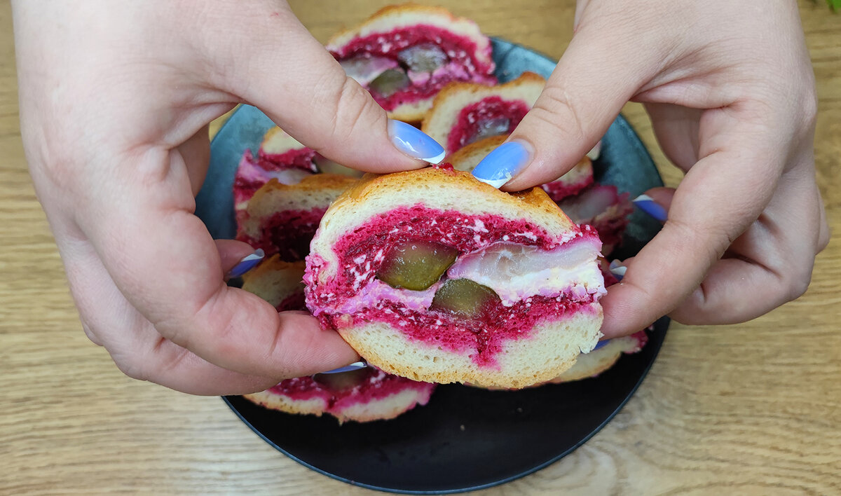Сборка проста: на одну сторону багета кладут свекольную массу, сверху — огурец, затем яичную начинку и, наконец, филе селедки. Закрывают рулет и плотно удавливают пленкой. Холодильник на 2–3 часа закрепит слои и усилит вкус.
