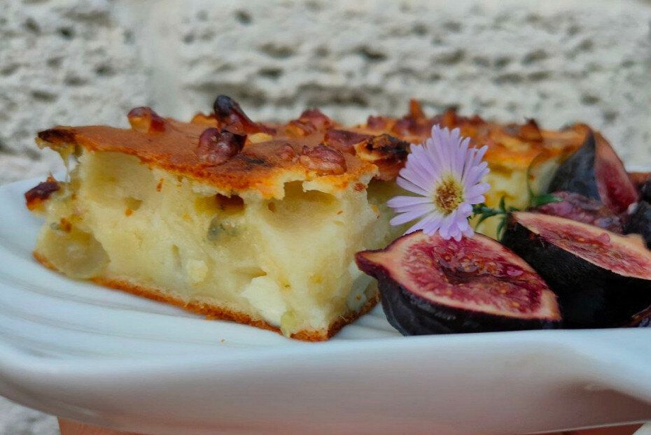 Подготовленное тесто выливается в форму для запекания, равномерно распределяется, а сверху накрошите грецкие орехи. Духовку предварительно разогрейте до 180 градусов и запекайте пирог в течение 40 минут. Проверку готовности можно осуществить с помощью зубочистки: тесто должно быть влажным, но палочка при этом должна оставаться сухой.