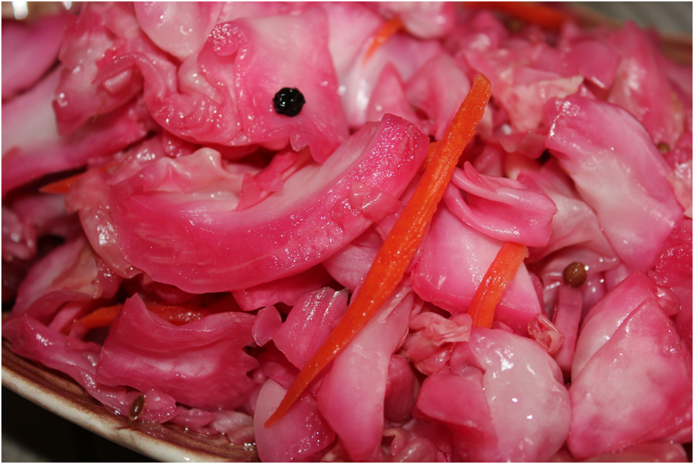 Приготовление начинается с нарезки капусты на квадратные кусочки. Затем, не забыть порезать чеснок, морковь и свёклу. Эти овощи можно нарезать как угодно — кружками, соломкой, или на терке, в зависимости от предпочтений. Далее необходимо тщательно перемешать все нарезанные ингредиенты и добавить семена укропа.