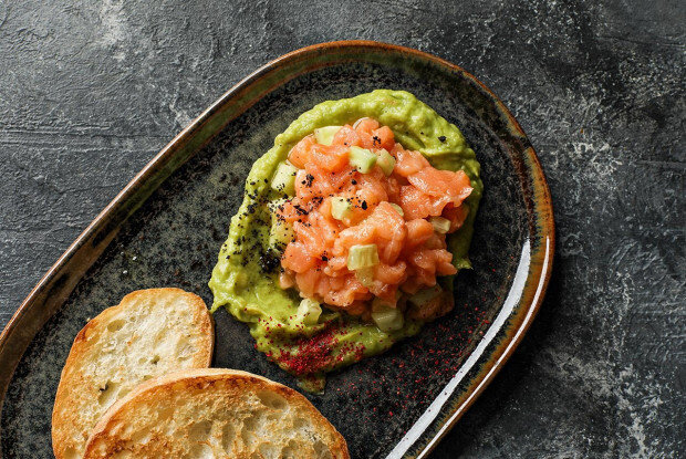 3. Параллельно подрумяньте два кусочка чиабатты в духовке до золотистого цвета. На тарелку выложите массу из авокадо, в центр поместите маринованный лосось, а по краям разместите подрумяненные кусочки хлеба. Завершите оформление высушенными маслинами, мелко нарезанными ножом. Ваш тартар готов!
