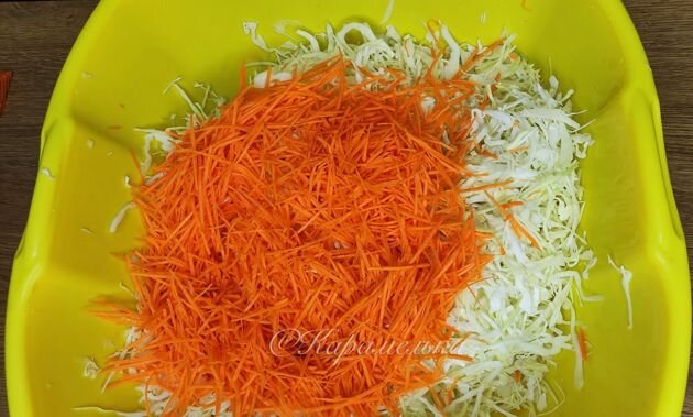 При выборе капусты стоит отдать предпочтение плотным вилкам. Сначала хорошо промойте её и уберите верхние листья. Далее нашинкуйте капусту, чем мельче, тем вкуснее. Крупно натрите морковь для добавления к капусте и основательно перемешайте их. Разложите полученную массу по банкам, плотно утрамбовывая и добавляя соль и воду.