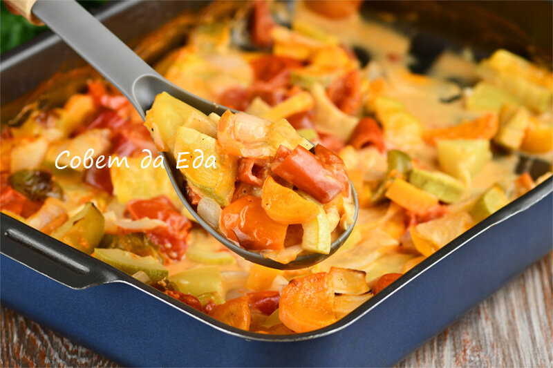 6. Получившимся соусом заливаются овощи, после чего форма отправляется в разогретую до 200 градусов духовку на 45 минут. В течение этого времени можно аккуратно перемешать содержимое один раз.