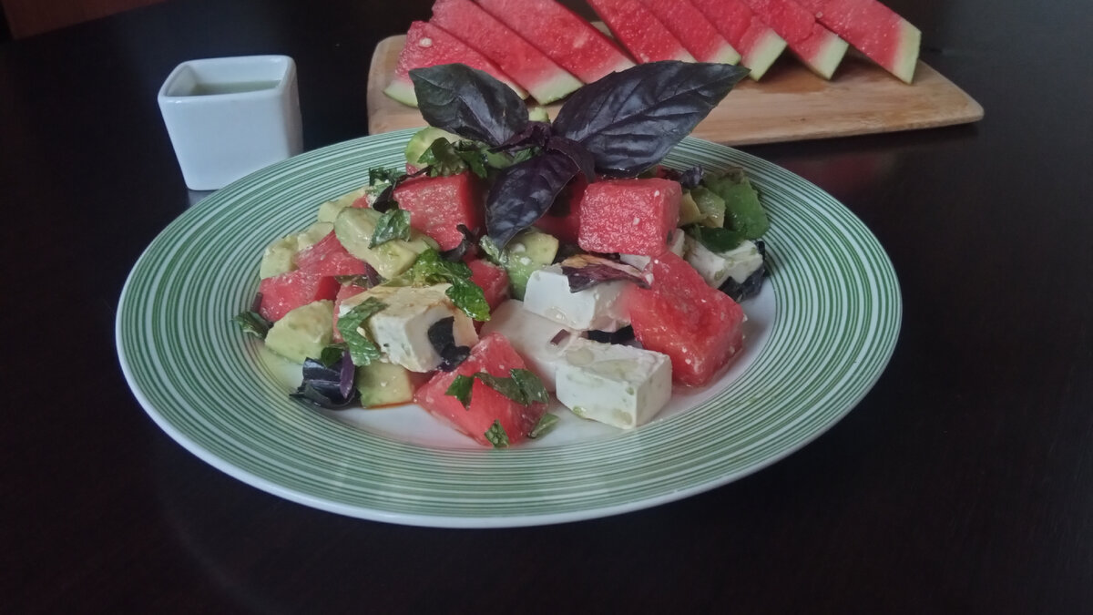 Основные компоненты: сладкий арбуз, солёная брынза и мякоть авокадо, дополняются ароматными травами, бальзамическим уксусом и оливковым маслом.
