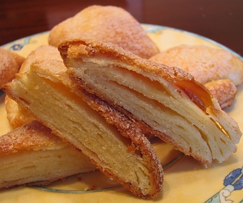 В неглубокой тарелке насыпьте сахар. Для особого аромата можно добавить немного молотой корицы. Каждый кусочек теста нужно разомнуть в лепешку, обвалять в сахаре, затем сложить пополам с сахаром внутрь, повторить процесс складывания несколько раз. Это создаст воздушную текстуру и хрустящий сахарный верх.