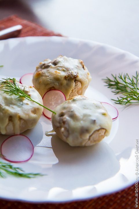 - Добавить к смесь зелень и специи, затем нафаршировать шляпки грибов.