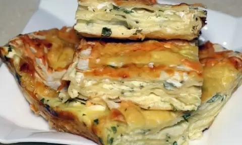 Теперь можно собрать пирог. Форму для запекания следует смазать сливочным маслом, выстлать первым слоем лаваш и залить частью сырной начинки. Продолжайте чередовать слои лаваша и начинки, пока не достигнете желаемой высоты. Обязательно завершите сборку слоем лаваша, который нужно смазать взбитым яйцом и обсыпать тертым сыром.
