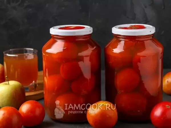 Залить помидоры горячим яблочным соком, закрыть крышками. Перевернуть банки, укутать их и оставить до полного остывания.
