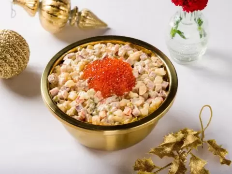 Авторитет заведения решился на смелое перевоплощение классического блюда – оливье. Теперь его готовят с использованием копченой курицы, докторской колбасы, говяжьего языка, хрустящих соленых огурчиков и, конечно, картофеля. А завершается это кулинарное произведение искусства щедрой горкой красной икры, поданной в элегантном золотом тазике. Такой подход придает привычному салату совершенно новый статус.