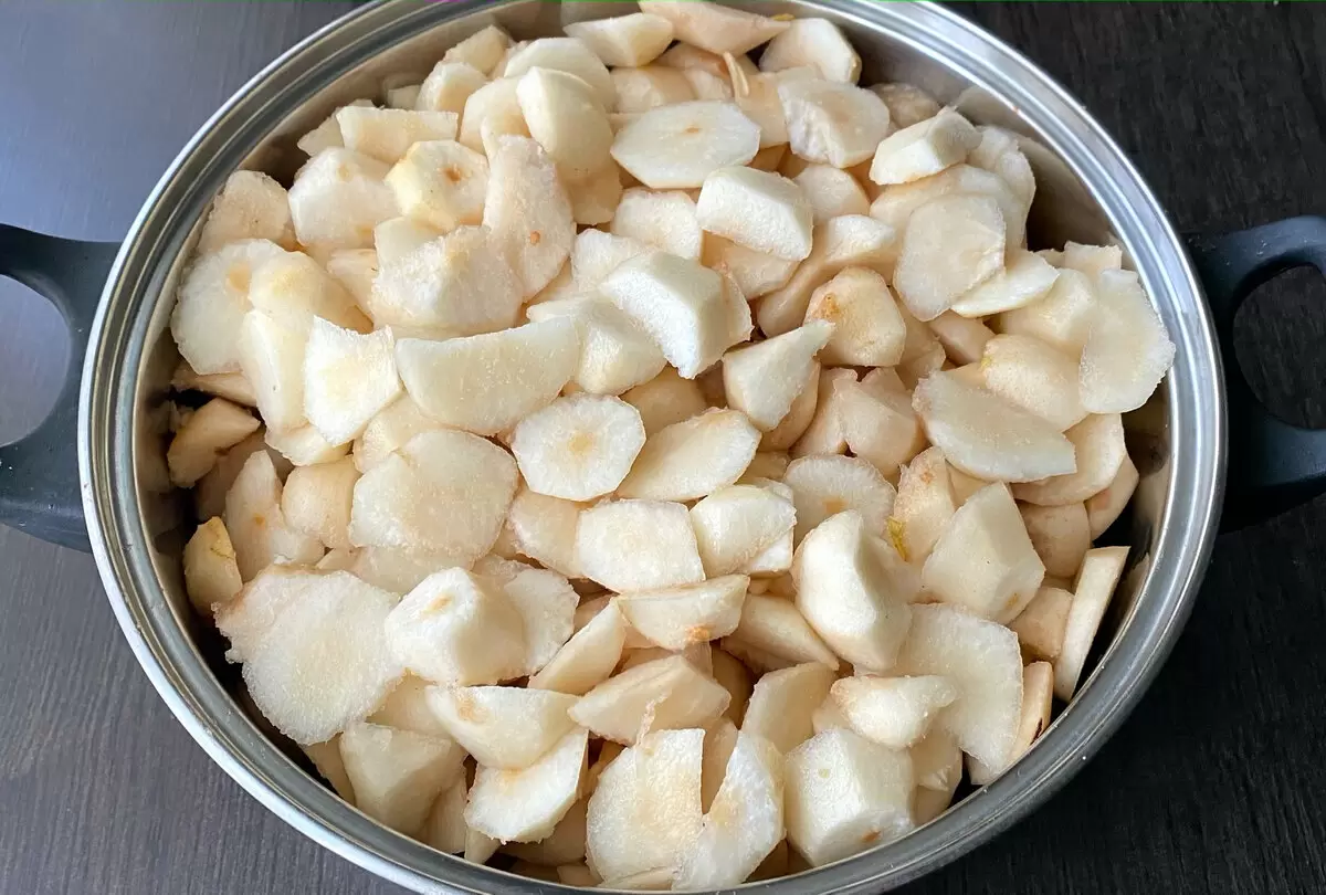 1. Подготовка груш: Плоды тщательно промыть, очистить от кожицы и удалить сердцевину. Нарезать на мелкие кусочки и выложить в кастрюлю с двойным дном.