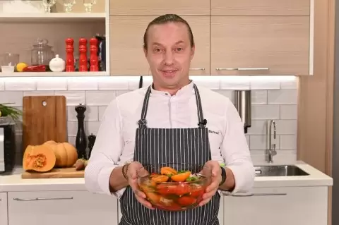 В небольшой сотейник налить воду и довести до кипения. Всыпать соль и черный перец горошком, добавить лавровый лист и тщательно перемешать.Срезать основания стеблей сельдерея и добавить их в закипающий маринад. Как только маринад начнёт бурлить, влить уксус и снять с огня.Нарезать стебли сельдерея на небольшие кусочки и отправить в глубокую кастрюлю, где будут мариноваться томаты.Отрезать два кружочка от головки чеснока, разрезая зубчики поперек, и добавить их к сельдерею в кастрюле.Сливы разрезать пополам и поместить в кастрюлю к чесноку и сельдерею, а оставшийся чеснок нарезать кружочками и распределить поверх томатов. Мелко порубить листья сельдерея и также добавить их в кастрюлю.Срезать укроп и добавить его вместе с «зонтиками» к томатам. Залить содержимое кастрюли горячим маринадом. При необходимости довести воду с уксусом до кипения и ещё немного подсолить.После этого оставить кастрюлю при комнатной температуре до полного остывания, затем убрать в холодильник на 1,5 суток.Яркое и ароматное блюдо, приготовленное по рецепту шеф-повара, станет отличным дополнением к любому застолью. Приятного аппетита!