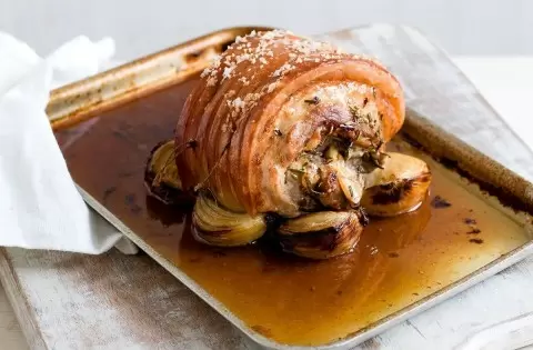 Теперь аккуратно сверните свинину и скрепите с помощью мясной бечевки. Приправьте 2 ч. л. морской соли и разместите на луковой подставке в противне. Для придания дополнительного аромата добавьте 150 мл белого вина и 150 мл воды. Выпекайте в горячей духовке в течение 1 часа, следя, чтобы мясо стало золотистым и хрустящим. Затем уменьшите температуру до 190°C (170°C с конвекцией), добавьте еще 150 мл вина и воды и верните в духовку еще на 30 минут. После этого дайте мясу отдохнуть в течение 10 минут перед нарезкой.