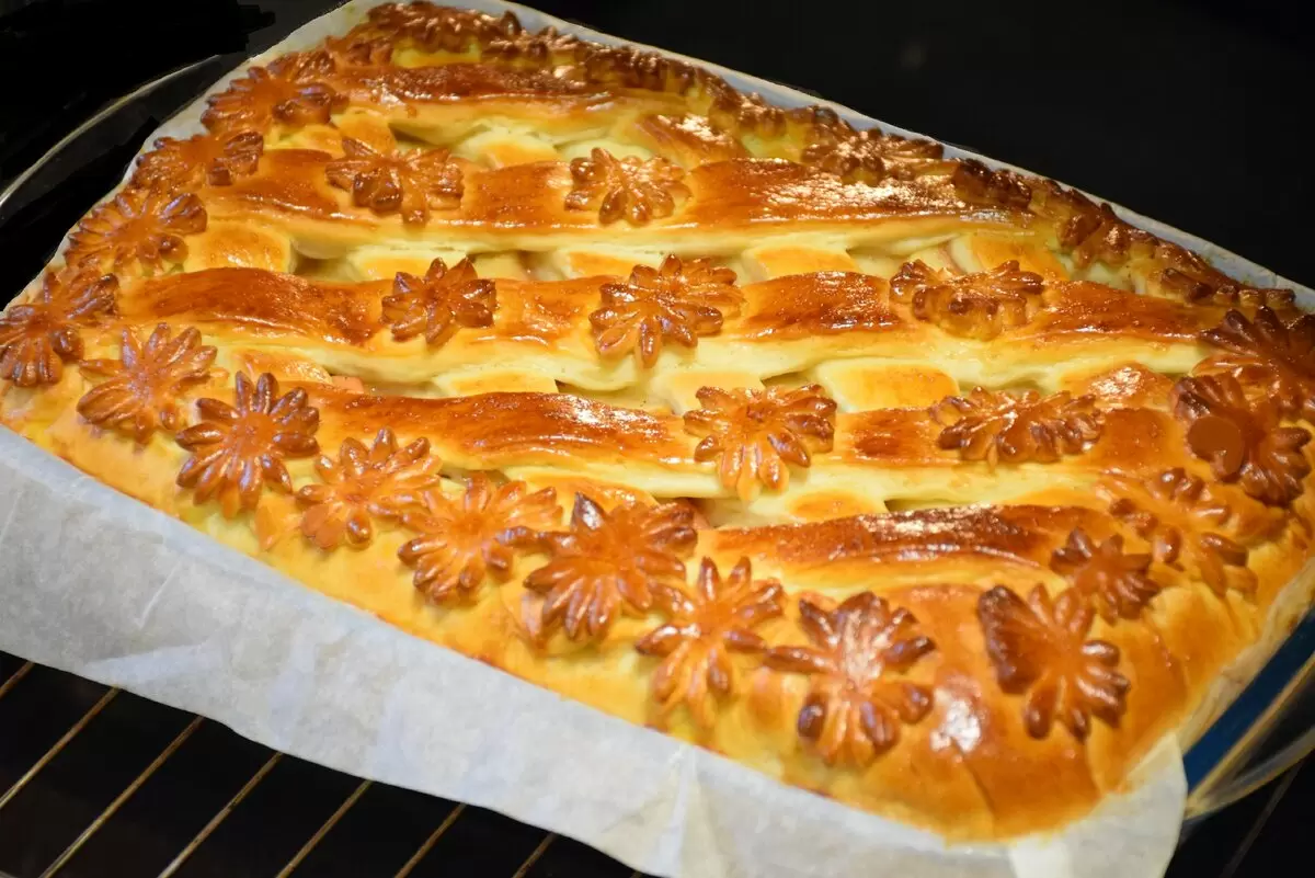 Как только тесто поднимется, обомните его и разделите на две части. Раскатайте одну часть, выложите в форму с бортиками, добавьте начинку и закройте вторую частью, украсив решеткой. Дайте постоять 20 минут, затем выпекайте 45 минут при 180 °C до золотистой корочки.