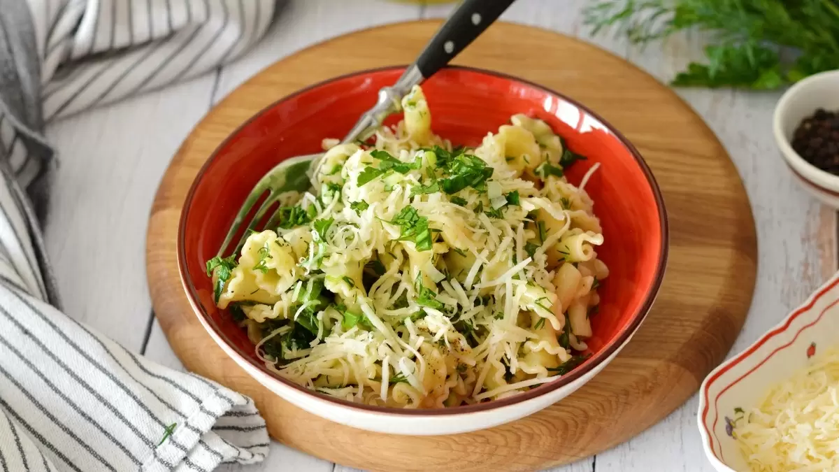 Шаг 3: После того как макароны будут готовы, откиньте их на дуршлаг, а затем верните в кастрюлю. Добавьте к ним нарезанную зелень, оливковое масло и 2 столовые ложки отвара из-под макарон. Перемешайте и поставьте на небольшой огонь еще на 1-2 минуты, постоянно помешивая. При необходимости добавьте свежемолотый перец.