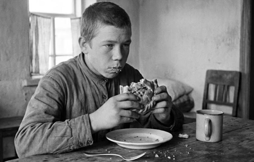 «Так ты без носков, а на улице снег», — замечает она, когда предлагает ему надеть новые тёплые носки. Митька смущается, но её улыбка развеивает его тревоги. Они предлагают ему пирог с капустой, и его мир наполняется ароматом, который вязнет в сердце. Такие простые моменты наполняют его внутреннее пространство теплом.