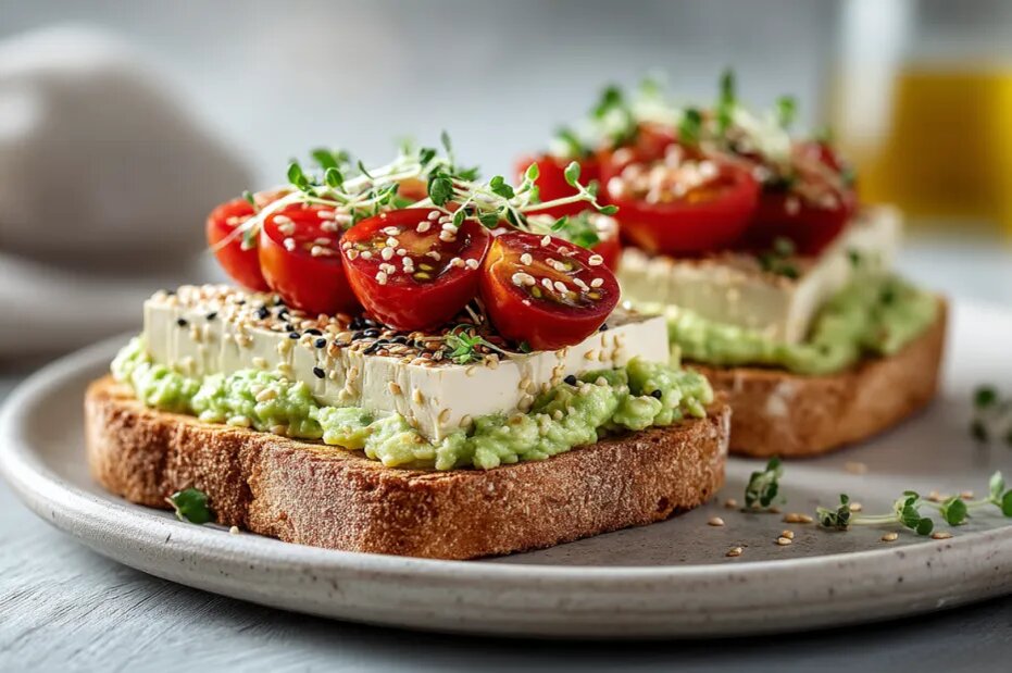 Приготовление занимает не больше времени, чем заварка кофе. Для начала, возьмите спелое авокадо и с помощью вилки превратите его в нежное пюре. Добавьте немного лимонного сока и посолите по вкусу. Эту массу размажьте на цельнозерновом хлебе. Далее, нарежьте копченый тофу тонкими ломтиками и выложите их поверх авокадо. Завершите блюдо несколькими половинками помидоров черри и присыпьте кунжутом для яркости и эстетики.