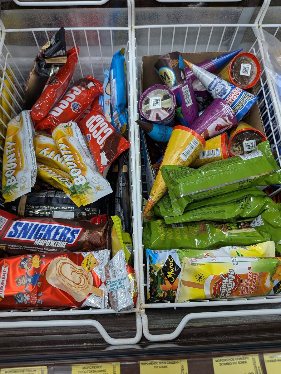 При входе в магазин, внимание сразу привлекает холодильник с мороженым. Новинка - мороженое со вкусом манго от 'Bounty' - не оставляет равнодушным: известный шоколадный бренд предлагает новый десерт, явно заслуживающий внимания. Также на полках можно найти пломбир в апельсиновой глазури от 'Чистой Линии' — сладость этого мороженого неоднократно завоевывала симпатии покупателей.