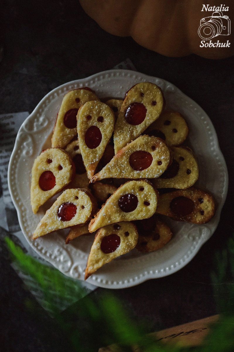 Нижнюю часть каждого печенья намазать клубничным джемом и накрыть второй половинкой с вырезами. Можно посыпать сахарной пудрой для большей эффектности. Готовое печенье не только выглядит привлекательно, но и удивляет своим вкусом!