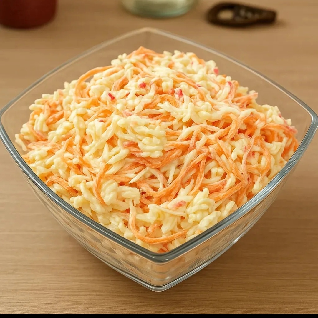 Первым делом в салатницу выкладывается морковь по-корейски. При необходимости, её можно порезать на более мелкие кусочки. Затем добавляются крабовые палочки, которые можно разделить на волокна для более интересной текстуры или нарезать соломкой. Для плавленого сыра стоит смазать терку растительным маслом, чтобы он не прилипал.