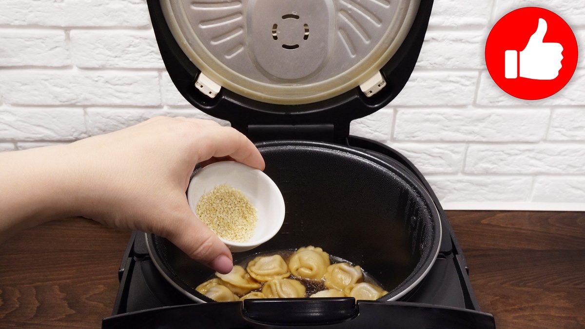 В чашу мультиварки следует налить горячую воду, добавить соевый соус и подсолнечное масло. Затем аккуратно выложить пельмени в один слой. Выбор режима «Выпечка» и настройка таймера на 13 минут помогут идеально их приготовить. После указанного времени нужно добавить измельчённый чеснок и кунжут. Тщательно перемешайте содержимое и оставьте на 3 минуты под крышкой в режиме подогрева — это придаст блюду особый аромат.