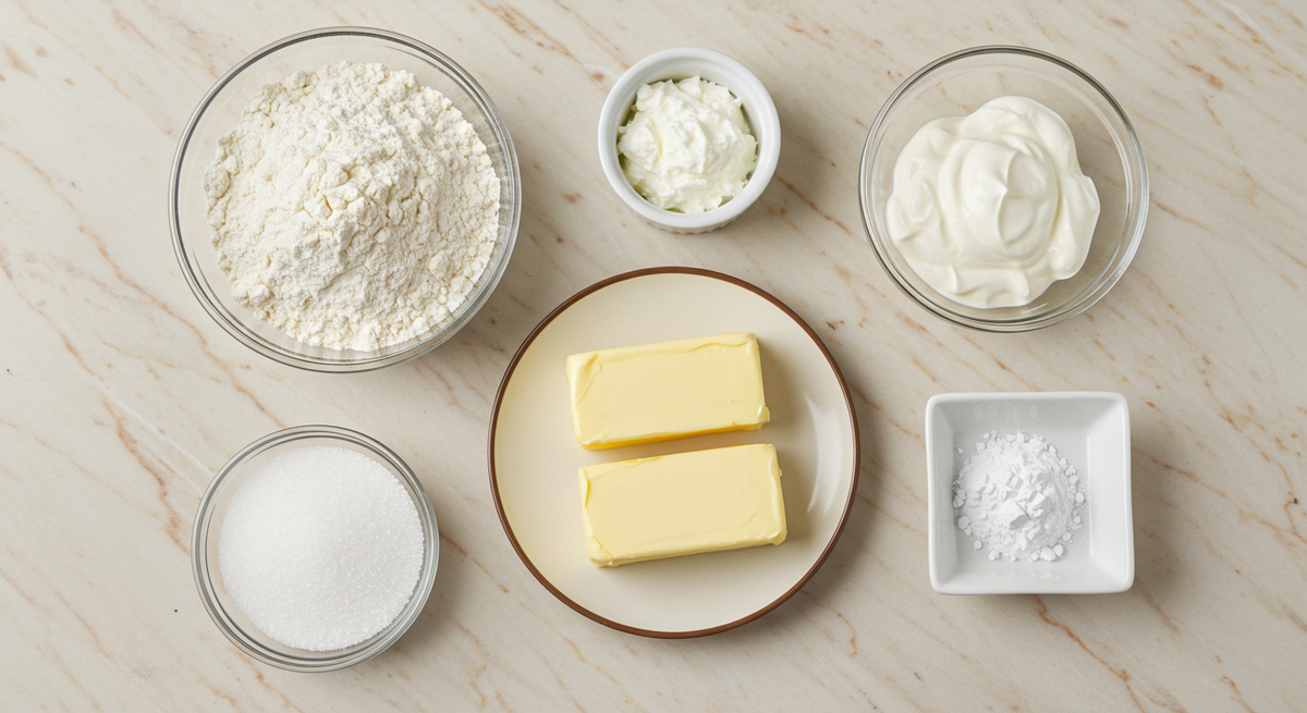 - Тесто: 200 г пшеничной муки, 100 г сливочного масла, 200 г сметаны (не менее 15% жирности), 1 ст. л. сахара, 1 ч. л. разрыхлителя.
