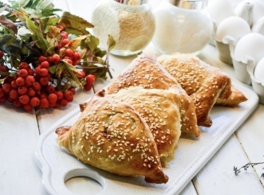 Выложить полученные треугольники на противень с пергаментом, смазать взбитым яйцом и посыпать кунжутом. Выпекать в разогретой до 180 °С духовке 40-60 минут до золотистой корочки и готовности начинки.