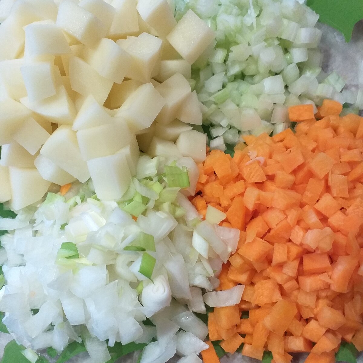 Для начала, овощи тщательно моются, очищаются и нарезаются мелкими кубиками. Морковь можно также нарезать, придавая дополнительный цвет и вкус. Картофель тоже порежьте кубиками.