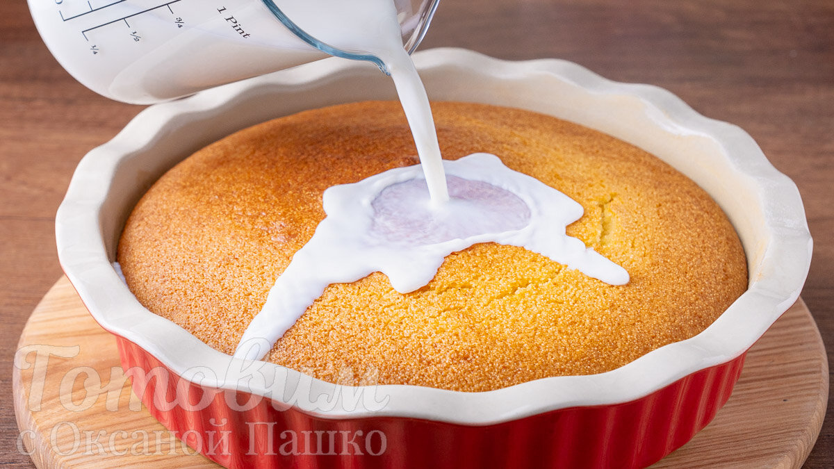 8. Вытащив готовый пирог, сразу полить его 300 мл молока. Оставить на некоторое время для впитывания молока и остывания.