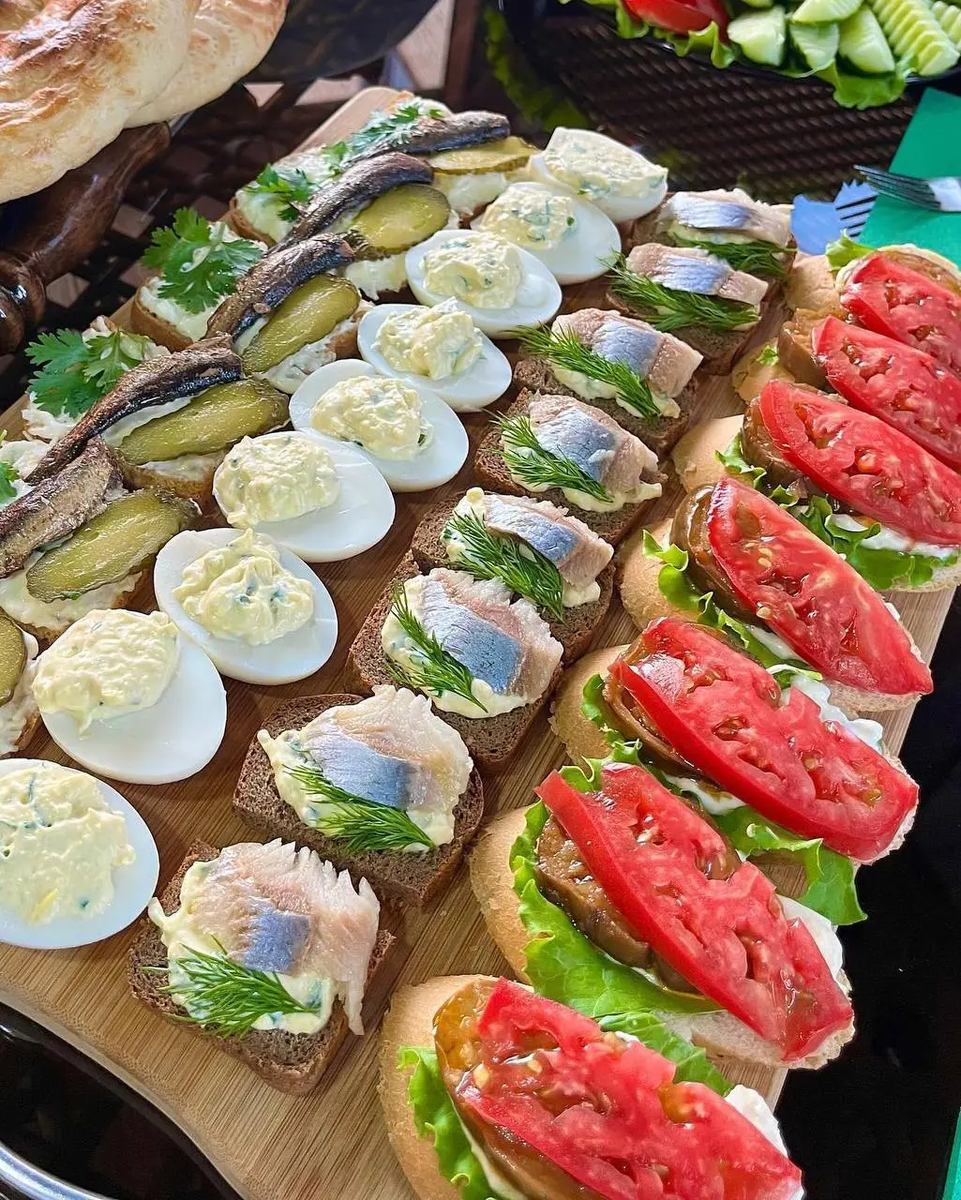 - Бутерброды с сельдью: На ржаном хлебе размазывают намазку из вареного яйца с майонезом и добавляют рубленый укроп и зеленый лук. Завершают закуску малосольной сельдью.