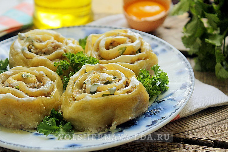 К этому моменту тесто уже отдохнуло, его разделяем на две части. Раскатываем одну часть в тонкий пласт, выкладываем половину фарша, сворачиваем рулетом и нарезаем на кусочки толщиной 3-4 см. Каждый кусочек обмакиваем в муку и придаем форму розочки. Чтобы сделать это легче, можно вырезать кружочки теста и делать надрезы перед заполнением фаршем.