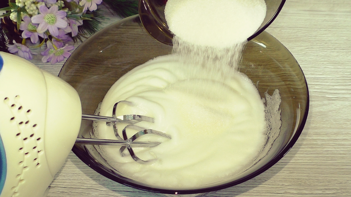 Для начала отделите белки от желтков. Взбейте белки с щепоткой соли до образования пены, затем добавьте сахар и ванильный сахар, продолжая взбивать. Влейте молоко и масло, хорошо перемешайте. Постепенно вводите муку с разрыхлителем, замешивая однородное тесто. Можно использовать как миксер, так и лопатку; если выбираете миксер, сначала перемешайте на низкой скорости, чтобы мука не разлетелась.