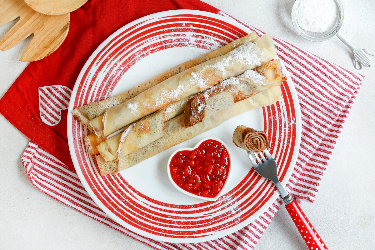 Шаг 3: На каждый готовый блинчик выложите ложку маскарпоне, слегка размажьте и сверните в трубочку. Подавайте с клубничным конфитюром, и ваш десерт будет готов в считанные минуты!