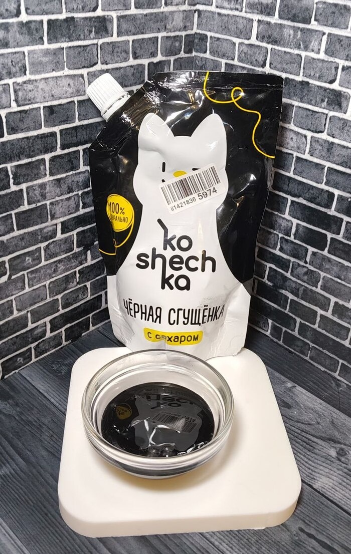 Первая находка — чёрная сгущёнка объемом 270 г. Цена на неё составляет 130 рублей. Произведена она с добавлением пищевого угля, обозначаемого как Е153. Интригующим является то, что надпись «сгущёнка» на упаковке может вызвать недоумение. Важно помнить, что настоящая сгущёнка должна объявляться как сгущённое молоко. Тем не менее, в составе на первом месте указано молоко, затем сыворотка. Вкус напоминает традиционное сгущенное молоко, но текстура и насыщенность несколько ниже, чем у классического варианта, например, «Рогачёва». Она отлично выглядит на блинах, хотя вкус — лишь средний.