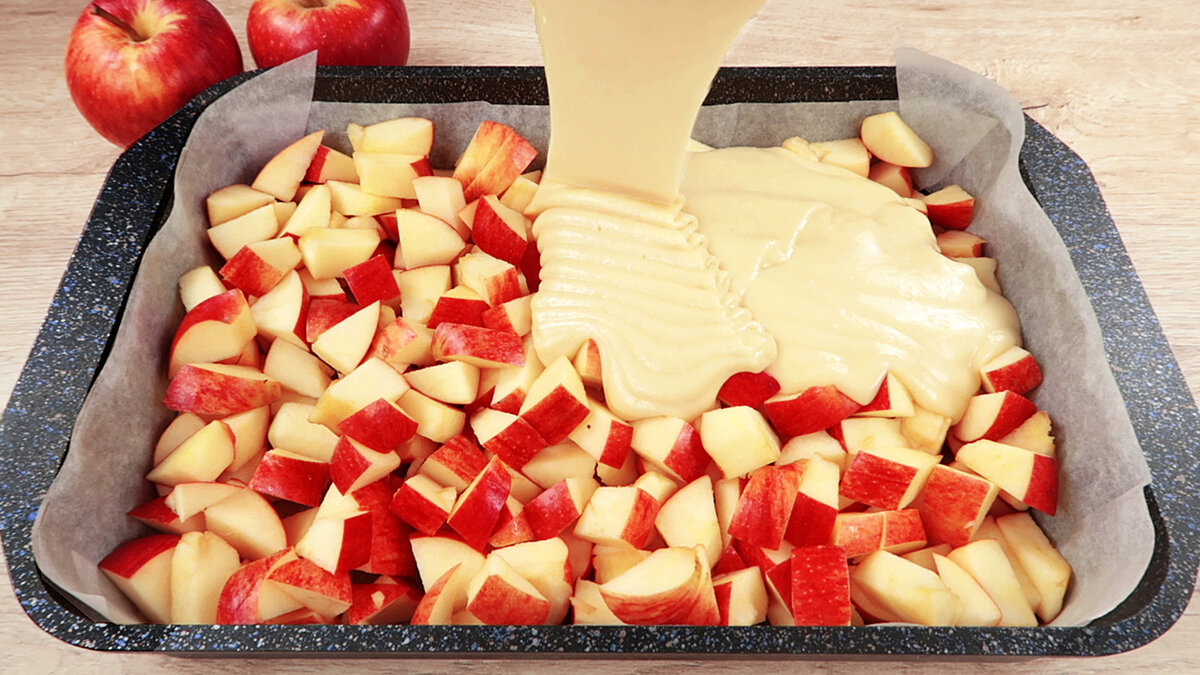 Теперь пора заняться яблоками. Их необходимо разрезать на половинки, затем каждую половинку нарезать кубиками. Подготовленные яблоки высыпать в форму для запекания и сверху равномерно залить тестом.