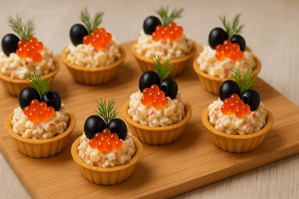 После этого начинка аккуратно распределяется по тарталеткам, создавая аппетитные горки. Для завершения блюда тарталетки украшаются красной икрой, маслинами и веточками укропа. Эта красочная закуска станет настоящим украшением любого стола и подарит радость вашим гостям!