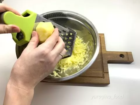 Первым шагом следует очистить и тщательно промыть картофель, после чего натереть его на крупной терке. Не забудьте немного посолить и дать постоять в течение 5 минут, чтобы выделился сок. Затем отделите желтки от белков — белки нужно будет взбить до стабильной пены.