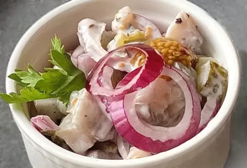 В глубокой миске смешайте нарезанную сельдь, лук и подготовленную горчицу. Нарежьте огурцы соломкой, отожмите лишнюю жидкость и добавьте в смесь. Полейте все белым винным уксусом и добавьте каперсы, щедро перемешайте, чтобы всё хорошо пропиталось.