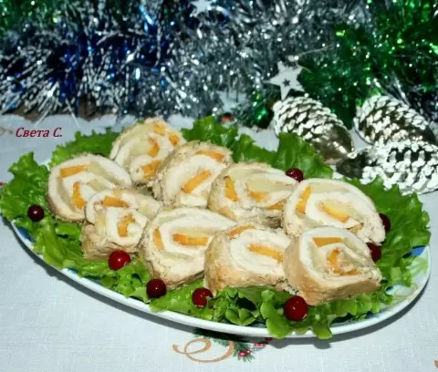После готовности охладить рулет, нарезать на кусочки и подать на листьях салата, украсив клювой.