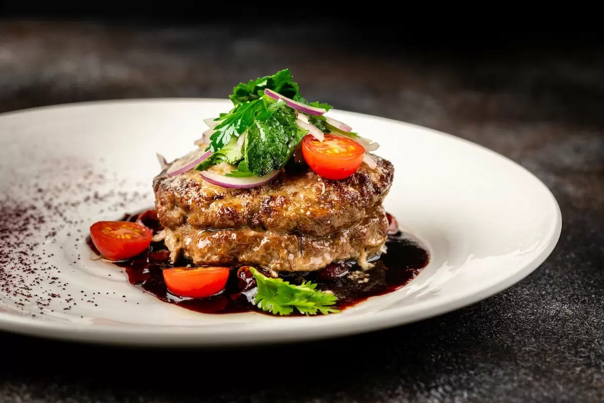 Первым шагом следует прокрутить мясо через мясорубку. Затем, добавив горчицу, вустерширский соус, 10 граммов соли и 3 грамма перца, хорошо перемешать все ингредиенты. Сформировать котлеты весом по 300 граммов, придавая им форму бургеров.Готовые бифштексы обжарить на хорошем оливковом масле до получения золотистой корочки с обеих сторон. После этого разместить их в противне и сверху посыпать тертым пармезаном или положить по ломтику горгонзолы на каждую котлету. Убрать в разогретую до 200 градусов духовку примерно на 12 минут.Помидоры черри нарезать дольками и смешать с зеленью. Добавить немного соли и заправить оливковым маслом для яркого вкуса.Для соуса вишневое варенье разогреть, добавив немного воды до желаемой консистенции, а после — немного свежемолотого перца.При подаче на тарелку вылить вишневый соус, уложить сверху бифштекс, дополнить зеленым салатом с помидорами и наслаждаться.