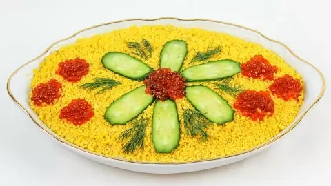 Оставшийся салат лучше подсунуть в холодильник на 2-3 часа, а лучше оставить на ночь, чтобы все слои пропитались. Перед подачей украшают свежим огурцом, икрой и зеленью укропа. Салат «Нежность» станет изысканным украшением вашего стола в этот праздничный вечер!