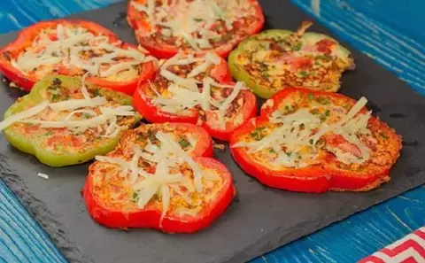 Теперь сладкий перец требуется промыть, подсушить и нарезать кольцами толщиной около 0,5 см, удаляя семена. На разогретую сковороду с оливковым маслом выкладываем кольца перца, в каждое из которых помещаем начинку. Необходимо следить за тем, чтобы начинка не вытекала за края.