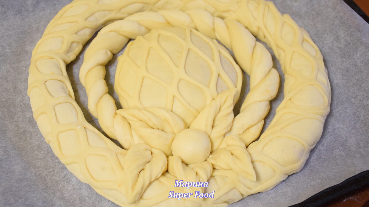 Как только тесто увеличится в объеме, его необходимо разделить на четыре части. Одна из них — для формирования центральной части пирога. Остальные кусочки используются для декора и края. Каждый кусочек теста аккуратно раскатывается и заполняется начинкой, а затем зажимаются края. Для украшения можно использовать фигурный нож.